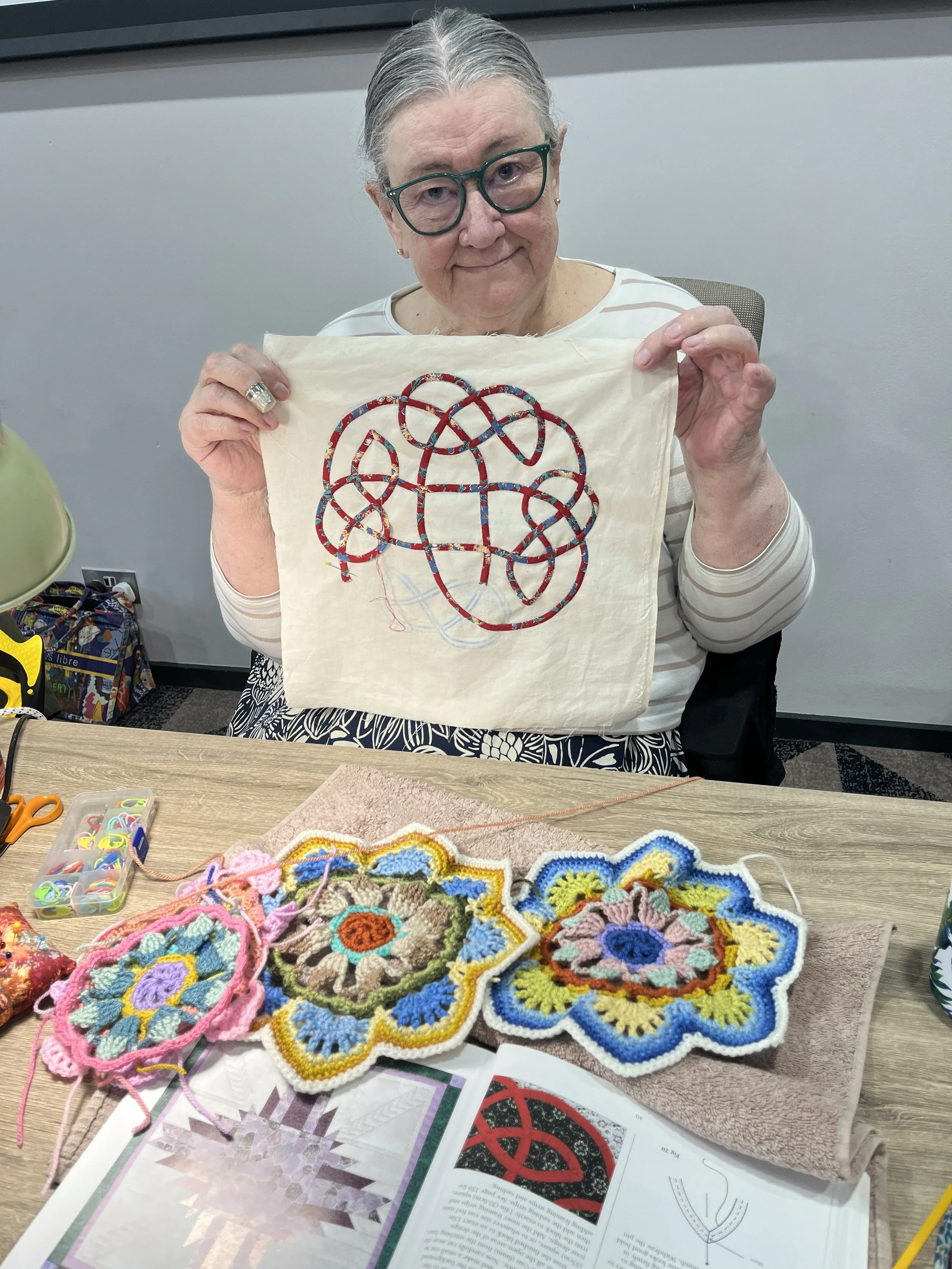 The demonstrations included : applique, hand quilting, vintage machine quilting (and Applicut machine), English paper piecing (EPP), Sashiko, going round in circles, embroidery and free motion quilting.